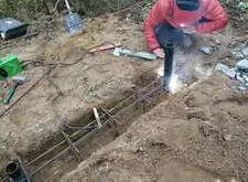 В траншею укладываем арматурную сетку, приварив её к только что вкрученным сваям.