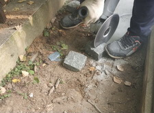 Начинаем укладывать брусчатку, параллельно монтируя цветник из гранитных балок. Кое-где целые квадратики не помещались, поэтому нам приходилось распиливать существующую брусчатку на более мелкие части.