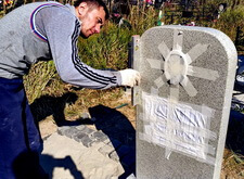 Замываем брусчатку и снимаем с надгробья защищающий надпись и фотокерамику скотч, протираем памятник от строительной пыли.