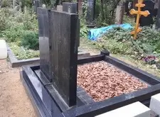 Возвращаем надгробья на место, укрепив подставку двумя рядами брусчатки. По периметру участка ставим гранитный цоколь, в качестве наземного покрытия остальной территории используем кору.