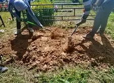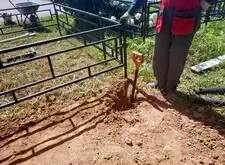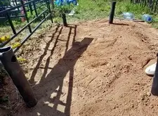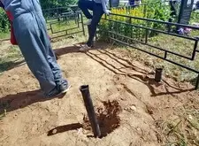 На каждом из четырёх углов вкручиваем сваи. Грунт на данной могиле попался твёрдый, после того, как сваи уже не вкручиваются, начинаем их забивать. Окончательно загнать сваи в землю так и не удалось, поэтому срезаем выступающие части. На качестве каркаса данное решение никак не отобразилось, так как длинна наших свай всегда несколько больше, чем требуется.