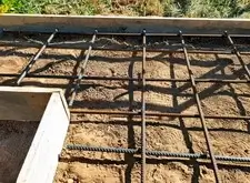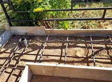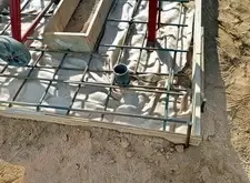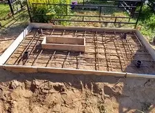 Далее выставляем опалубку, определяем место под цветник. Внутрь участка закладываем частую арматурную сетку. Там, где это возможно, привариваем её к сваям.