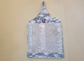 На фотографиях ниже отображено состоянии стены памяти после завершения всех работ. Таблички висят в определённом порядке, надписи легко читаются даже при небольшом освещении, а общая цветовая гамма удачно вписывается в церковный интерьер.